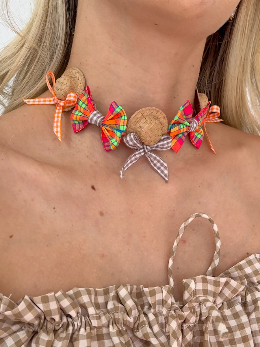O Choker Chapéuzinho Xadrez é feito com base de fita, mini chapéu e laços em padronagem xadrez.