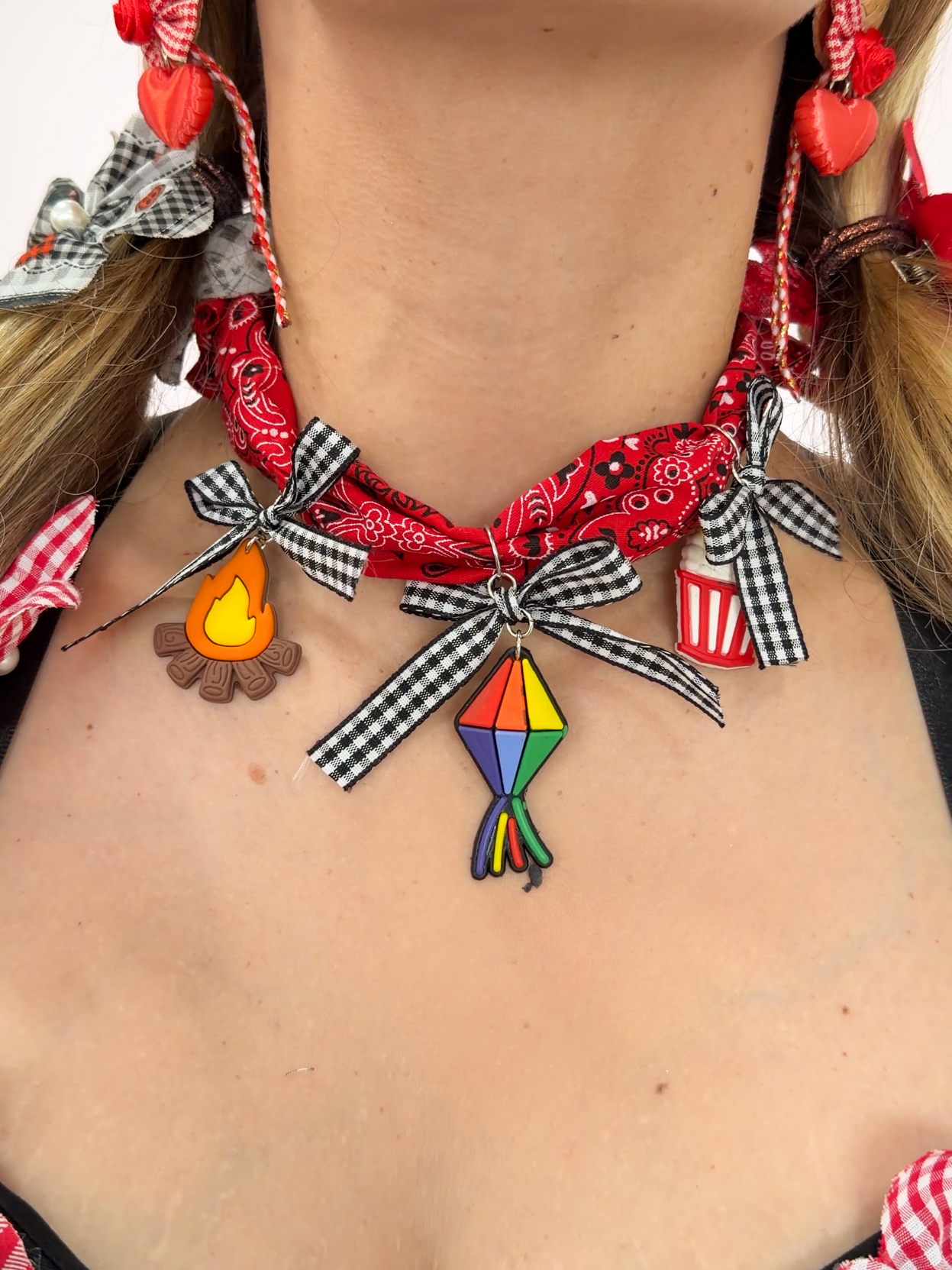 O Choker Pula a Fogueira é a definição de alegria junina em forma de acessório. Com base em bandana vermelha, laços em fita xadrez e três pingentes super especiais — fogueira, pipoca e balão colorido — ele é a escolha perfeita pra quem quer um look divertido, criativo e cheio de personalidade.