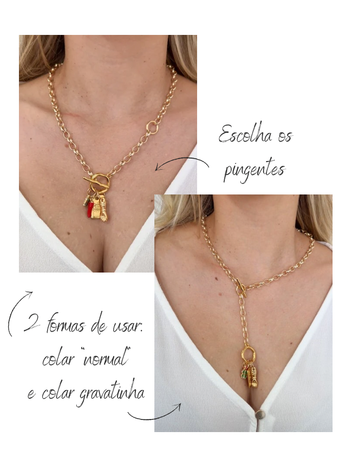 Modo gravatinha: com a ponta da corrente pendurada para baixo, trazendo um toque moderno e elegante.