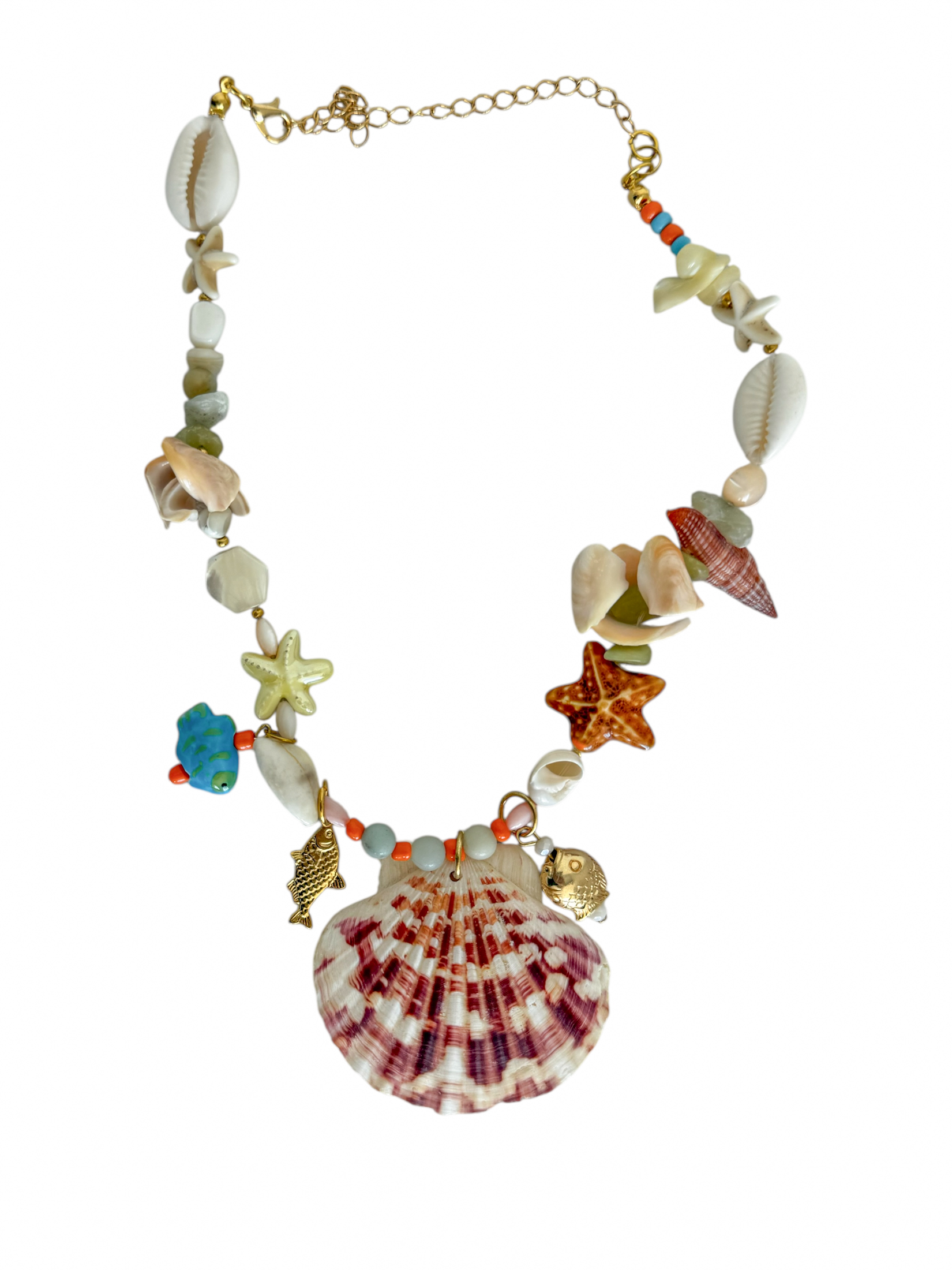 Feito com conchas naturais, estrelas-do-mar, peixinhos e detalhes em cerâmica pintada à mão, ele traduz a leveza e a energia do mar em um acessório único e artesanal.