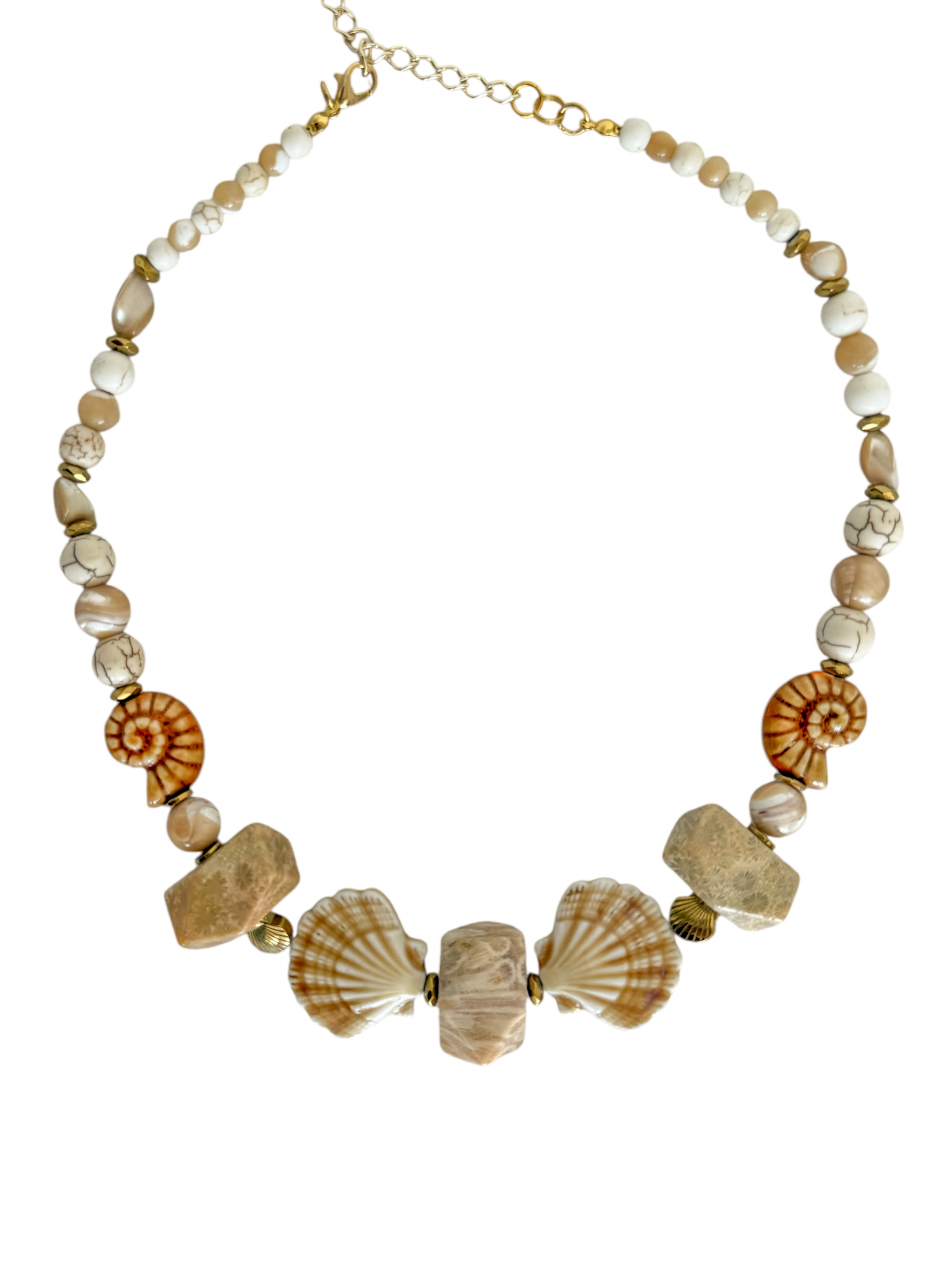 Um colar que mistura texturas e histórias do mar, combinando elementos artesanais e naturais em uma peça única.