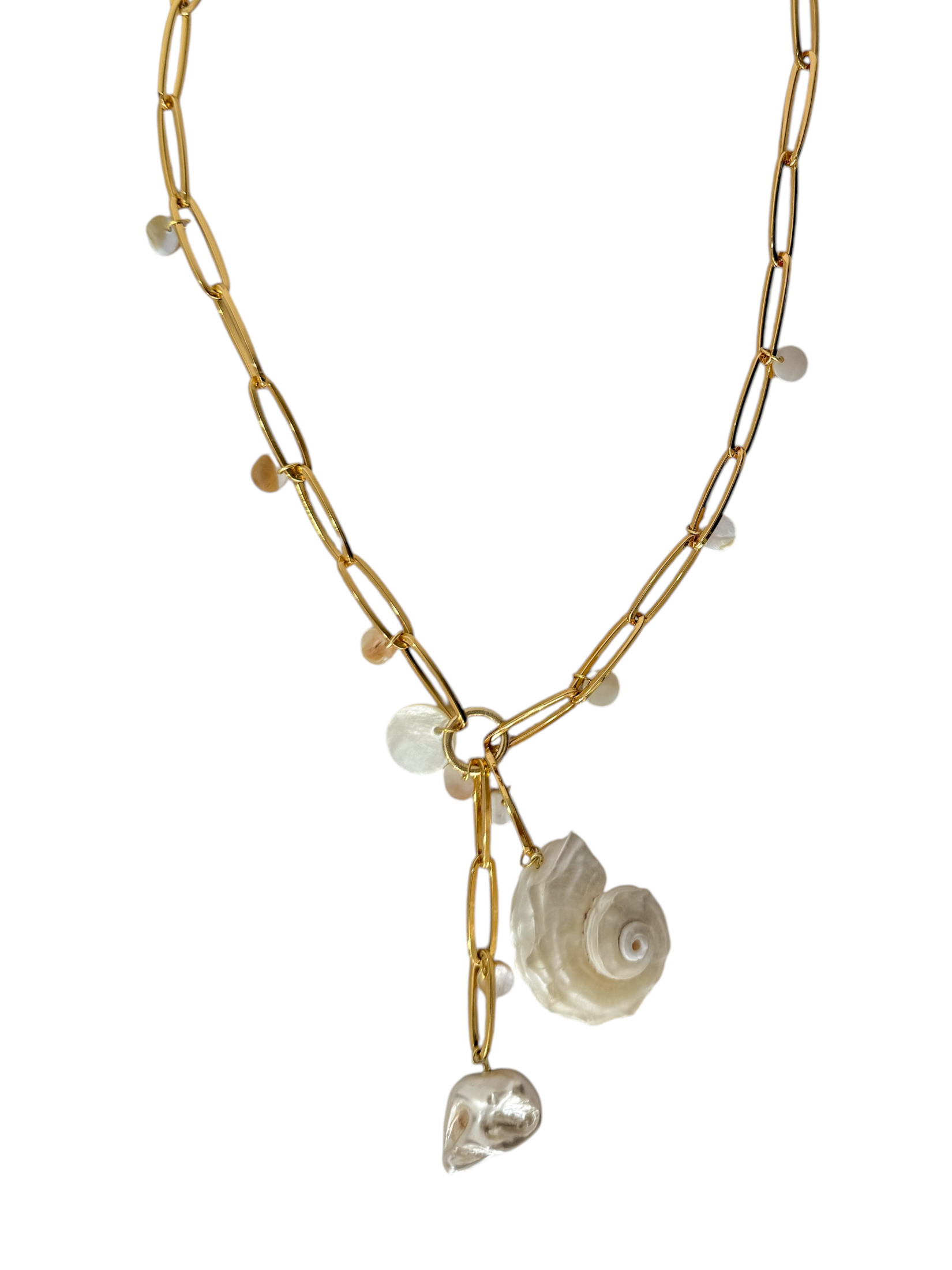 Inspirado na beleza natural do mar, o Colar Gravatinha Concha Pérola combina elementos orgânicos e sofisticados em uma peça única. A corrente estilo Cartier, com banho de 3milésimos e verniz protetor, recebe detalhes delicados de discos de madrepérola, uma concha natural perolizada e uma pérola shell, criando um visual elegante e atemporal.