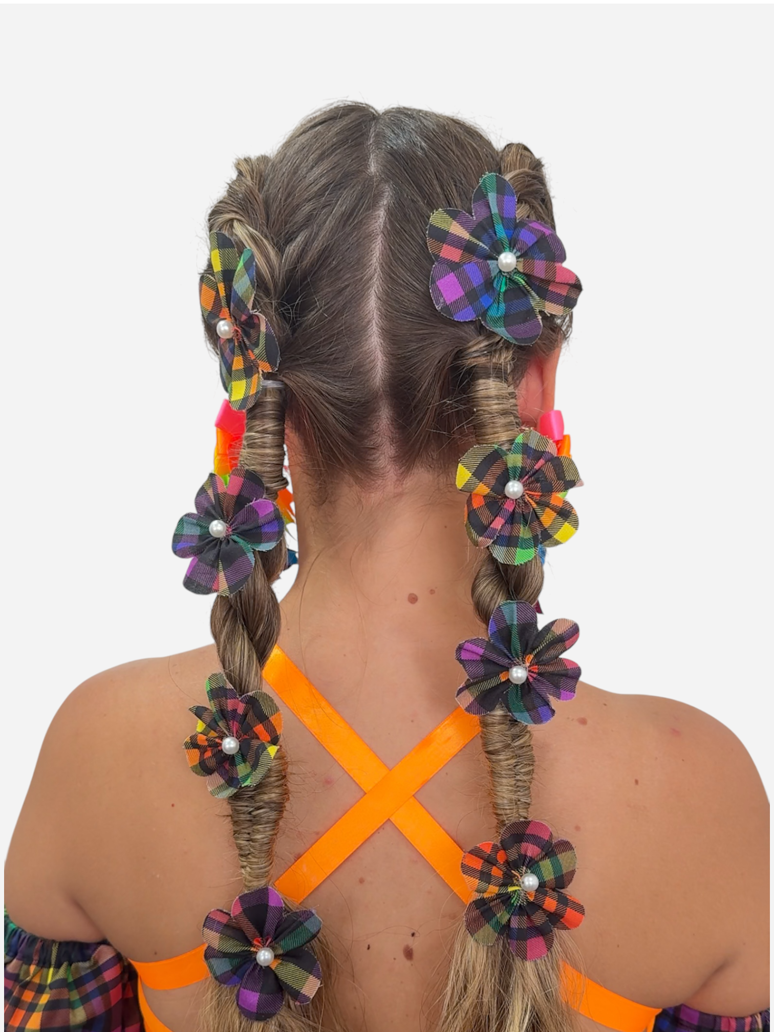 O KIT FLORZINHAS XODÓ traz 4 presilhas tipo bico de pato com flores feitas à mão em tecido xadrez colorido, com aplicação de pérola no centro. O resultado é uma composição alegre, vibrante e cheia de personalidade.
