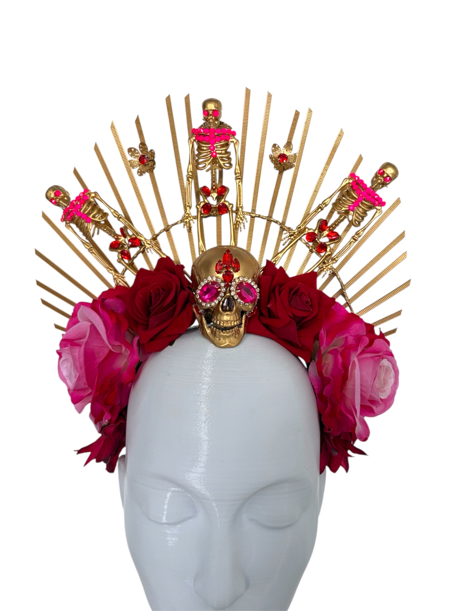 Composta por flores em tons vibrantes, crânios dourados cravejados de pedras e esqueletos, essa peça mistura o sagrado e o sombrio de forma teatral e magnética.
