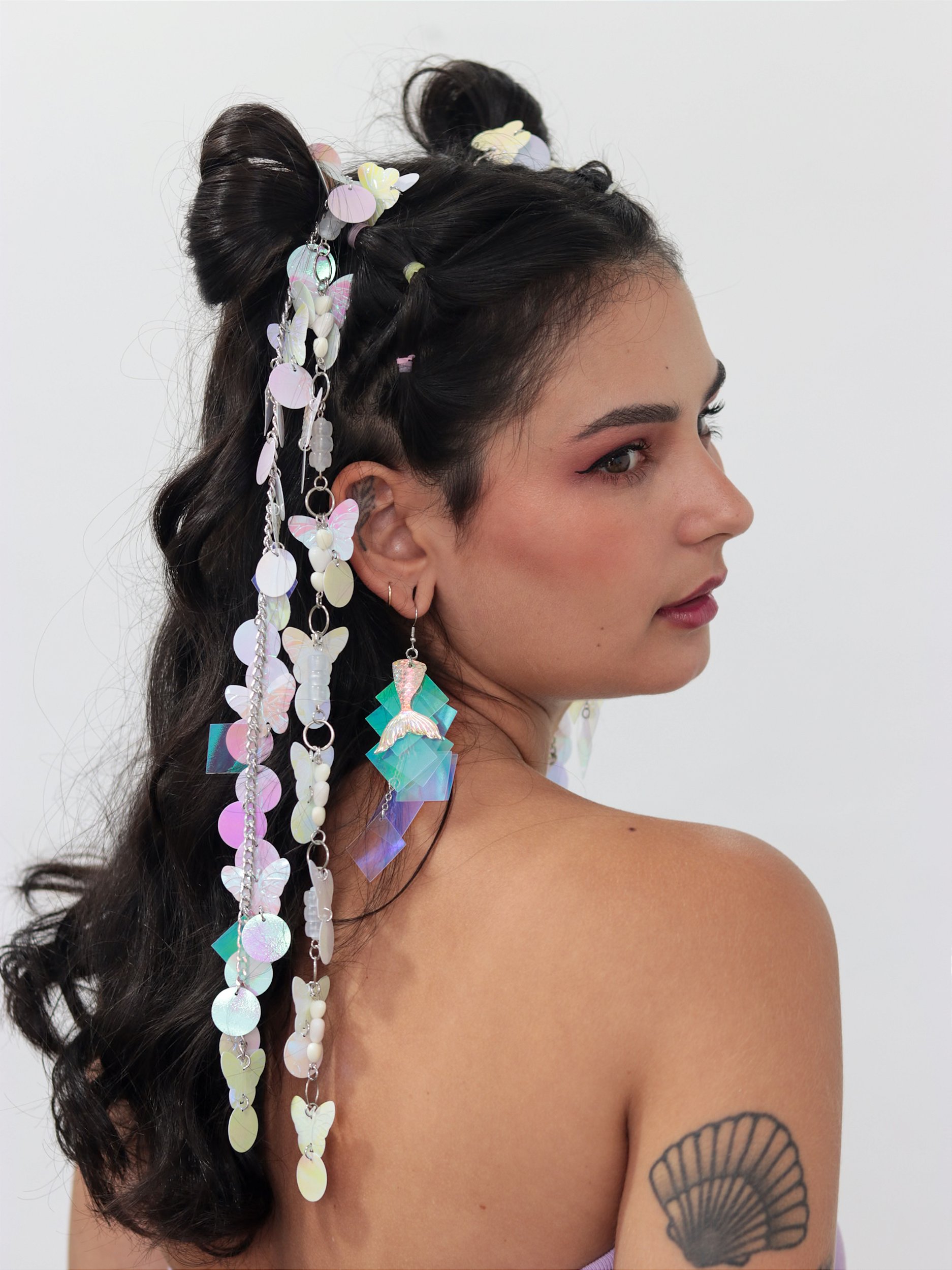 • Feito com duas correntes. A primeira é repleta de paetês holográficos e paetês de borboletas irizadas, brilha MUITO! A outra corrente é feita com argolas e contas que brilham no escuro!