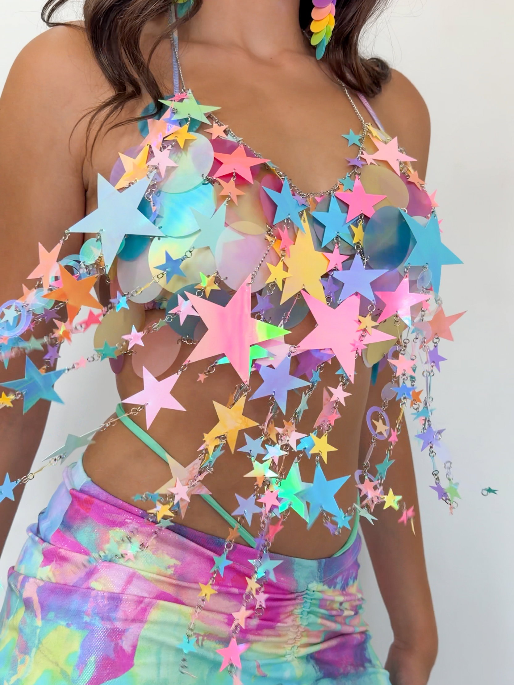 Top feito com correntes, paetês irizados e estrelas de paetês de diversos tamanhos e cores.