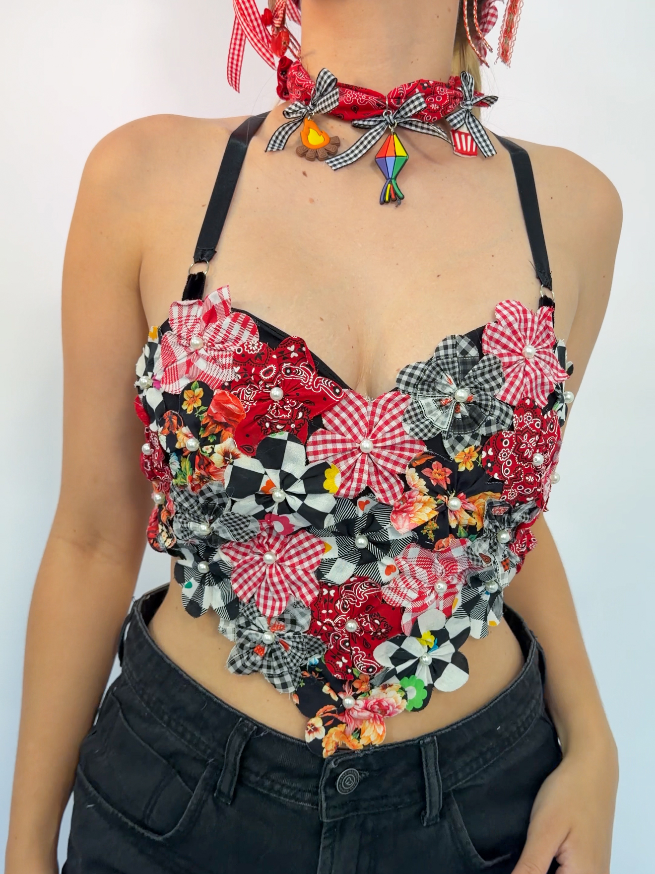 Um jardim inteiro pra vestir! O Top Flor do Arraiá é uma peça única, com modelagem que lembra um corselet, feito e ajustado à mão por nós. Ele valoriza o busto e abraça o corpo com amarração de fita de cetim nas costas.